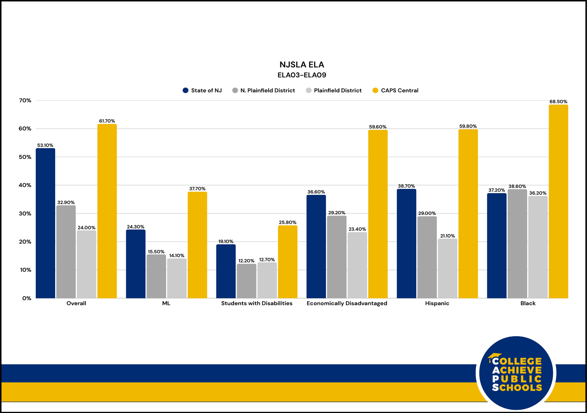 CAPS Central achieved 61.7% overall proficiency on the NJSLA ELA assessment, well above the New Jersey state average of 53.1%. Compared to local districts, CAPS Central students more than double that of North Plainfield (32.9%) and more than two and a half times that of Plainfield (24.0%), highlighting regional leadership in literacy outcomes.