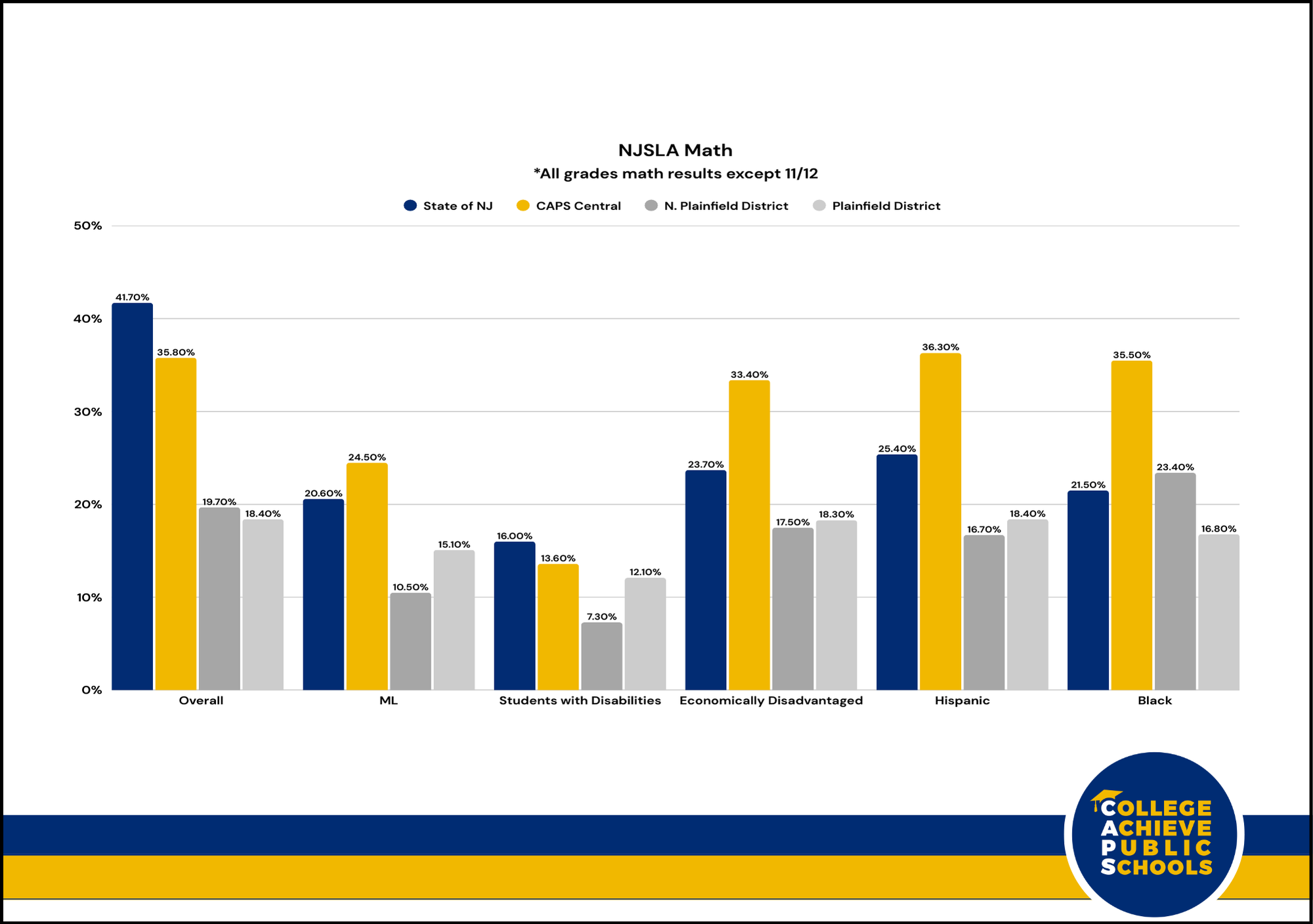 In math, CAPS Central achieved 35.8% overall proficiency, exceeding North Plainfield (19.7%) and Plainfield (18.4%) by wide margins. While overall math proficiency for grades 3‑10 is slightly behind the state average (41.7%), key subgroups demonstrate strong equity gains.